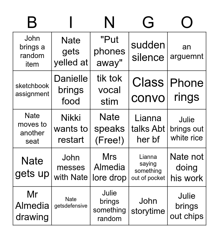 This bingo card has a free space and 24 words: John messes with Nate, Nate getsdefensive, tik tok vocal stim, Mr Almedia drawing, an arguemnt, John brings a random item, sketchbook assignment, Nate gets yelled at, Lianna talks Abt her bf, Mrs Almedia lore drop, Class convo, Nate moves to another seat, Lianna saying something out of pocket, Nate not doing his work, Danielle brings food, John storytime, Julie brings out white rice, "Put phones away", Phone rings, Nikki wants to restart, Julie brings out chips, Nate gets up, sudden silence and Julie brings something random.