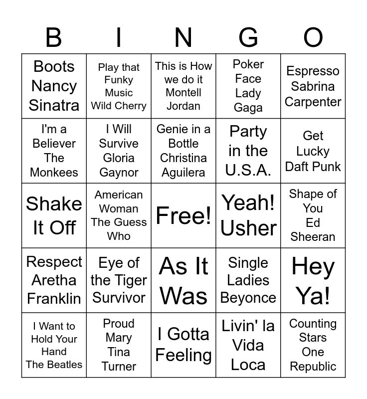 This bingo card has a free space and 48 words: Jailhouse Rock Elvis Presley, Proud Mary Tina Turner, Vogue Madonna, All for you Janet Jackson, Get Lucky Daft Punk, Be My Baby The Ronettes, Play that Funky Music Wild Cherry, Alive Pearl Jam, Yeah! Usher, Counting Stars One Republic, I'm a Believer The Monkees, I Will Survive Gloria Gaynor, Hollaback Girl Gwen Stefani, Shape of You Ed Sheeran, Aquarius/Let the Sunshine in The 5th Dimension, Wake me up Wham!, This is How we do it Montell Jordan, Single Ladies Beyonce, About Dang Time Lizzo, Boots Nancy Sinatra, Eye of the Tiger Survivor, Genie in a Bottle Christina Aguilera, Poker Face Lady Gaga, Espresso Sabrina Carpenter, Tutti-Frutti Little Richard, American Woman The Guess Who, I Want to Hold Your Hand The Beatles, Superstition Stevie Wonder, Respect Aretha Franklin, Hotel California Eagles, Mrs. Robinson Simon & Garfunkel, Don't Stop Believin' Journey, Suspicious Minds Elvis Presley, Take On Me A-ha, Vogue, The Sign, No Scrubs, Livin' la Vida Loca, Hey Ya!, Mr. Brightside, Hollaback Girl, I Gotta Feeling, Party in the U.S.A., Call Me Maybe, Shake It Off, Old Town Road, As It Was and Espresso.