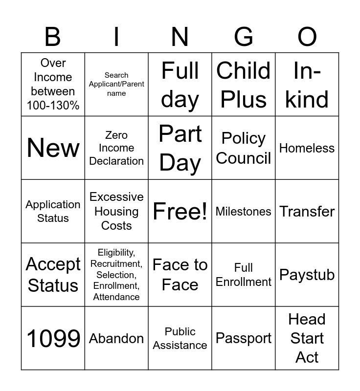 This bingo card has a free space and 57 words: Permanent Resident Card, 1099, Relevant Time Period, Over Income between 100-130%, Public Assistance, McKinney-Vento Act, Zero Income Declaration, Eligibility Verification Record, Policy Council, Board of Trustees, Child Plus, Over Income/Other Need, Chronic Absences, Attendance Plan, Unexpected Absence, Average Daily Attendance, In-kind, Excessive Housing Costs, Head Start Performance Standards, Head Start Act, Milestones, at or below 100%, Full Enrollment, Full day, School Year, Part Day, Program Term, Federal 1040, Homeless, 48 Hours, Application Event, Birth Verification, EVF, Drop, Transfer, New, Community Assessment, Application Status, Foster, Accept Status, Search Applicant/Parent name, Face to Face, Determine Eligibility, Eligibility Determination Record, Report #2025, Eligibility Priority Listing, Eligibility, Recruitment, Selection, Enrollment, Attendance, Abandon, Waitlist, Income/Source Documentation, Birth Certificate, Passport, VISA, Permanent Resident Card, Health Insurance Card, Paystub and W2.