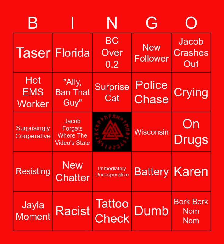 This bingo card has a free space and 24 words: New Chatter, Racist, Surprise Cat, Jayla Moment, Jacob Crashes Out, Taser, Hot EMS Worker, Florida, Wisconsin, Immediately Uncooperative, Police Chase, Surprisingly Cooperative, Battery, Karen, "Ally, Ban That Guy", Dumb, On Drugs, BC Over 0.2, Crying, Jacob Forgets Where The Video's State, Bork Bork Nom Nom, Resisting, New Follower and Tattoo Check.