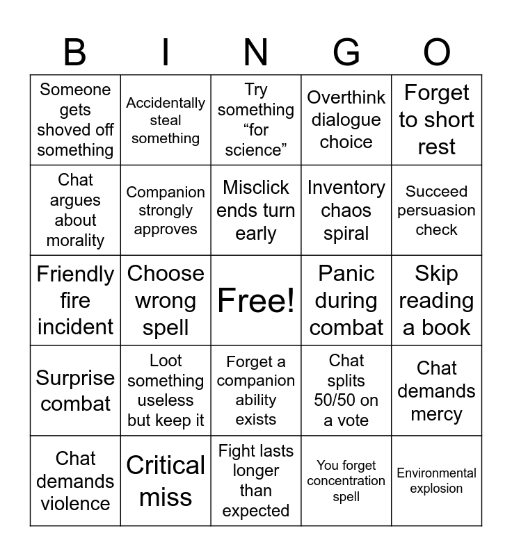 This bingo card has a free space and 60 words: Critical hit, Critical miss, Party member gets downed, Surprise combat, You forget concentration spell, Companion disapproves, Companion strongly approves, You reload a save, Inventory chaos spiral, Sell something important by accident, Overthink dialogue choice, Choose chaos instead of logic, Chat argues about morality, NPC flirts, You flirt back, Someone gets shoved off something, Environmental explosion, Forget to short rest, Forget to long rest, Misclick ends turn early, Panic during combat, Try something “for science”, Chat demands violence, Chat demands mercy, You say “wait what?”, You miss obvious loot, Hidden area discovered, Fail persuasion check, Succeed persuasion check, Wild magic effect, Companion trauma dump, Stealth immediately fails, Lockpick breaks, Talk your way out of a fight, Accidentally steal something, Guard gets suspicious, Forget quest objective, Choose wrong spell, Use environment creatively, Friendly fire incident, Someone gets crit twice in one fight, Loot something useless but keep it, Skip reading a book, Read every single book, Chat splits 50/50 on a vote, Romance progress, NPC threatens you dramatically, You second guess your build, Try to push an impossible roll, Forget a companion ability exists, Fight lasts longer than expected, You underestimate enemy strength, You overprepare, Talk to an animal, Make a morally questionable choice, Unexpected plot twist, You say “this is fine” during chaos, Fail stealth before it starts, Use an item you’ve been hoarding and Take fall damage from something silly.