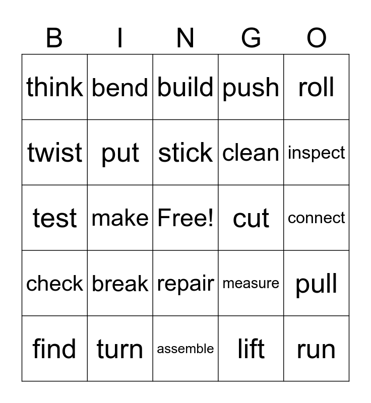 This bingo card has a free space and 29 words: find, have, make, try, think, build, put, break, cut, turn, connect, run, assemble, lift, inspect, install, repair, check, roll, test, measure, replace, clean, twist, push, bend, pull, stick and take.