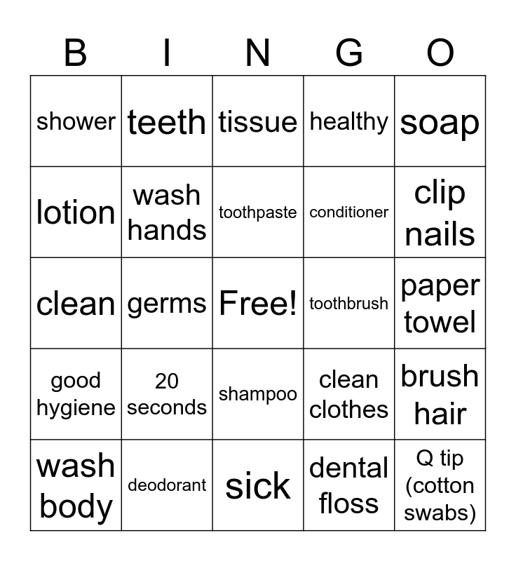This bingo card has a free space and 24 words: 20 seconds, deodorant, toothpaste, wash body, soap, shower, lotion, teeth, toothbrush, shampoo, conditioner, clean, clean clothes, brush hair, wash hands, dental floss, paper towel, tissue, clip nails, germs, Q tip (cotton swabs), good hygiene, healthy and sick.