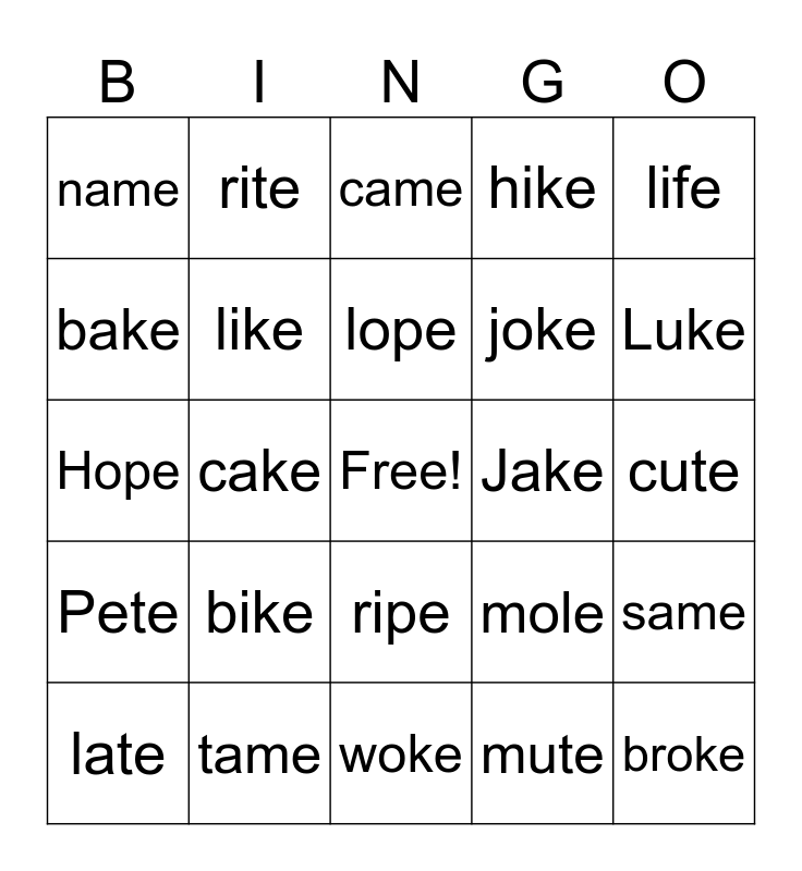 This bingo card has a free space and 29 words: late, make, cake, nose, name, came, like, bike, Jake, tame, cute, broke, woke, mute, Luke, wipe, ripe, Pete, life, Hope, mole, rose, joke, bake, hike, rite, same, lope and fume.