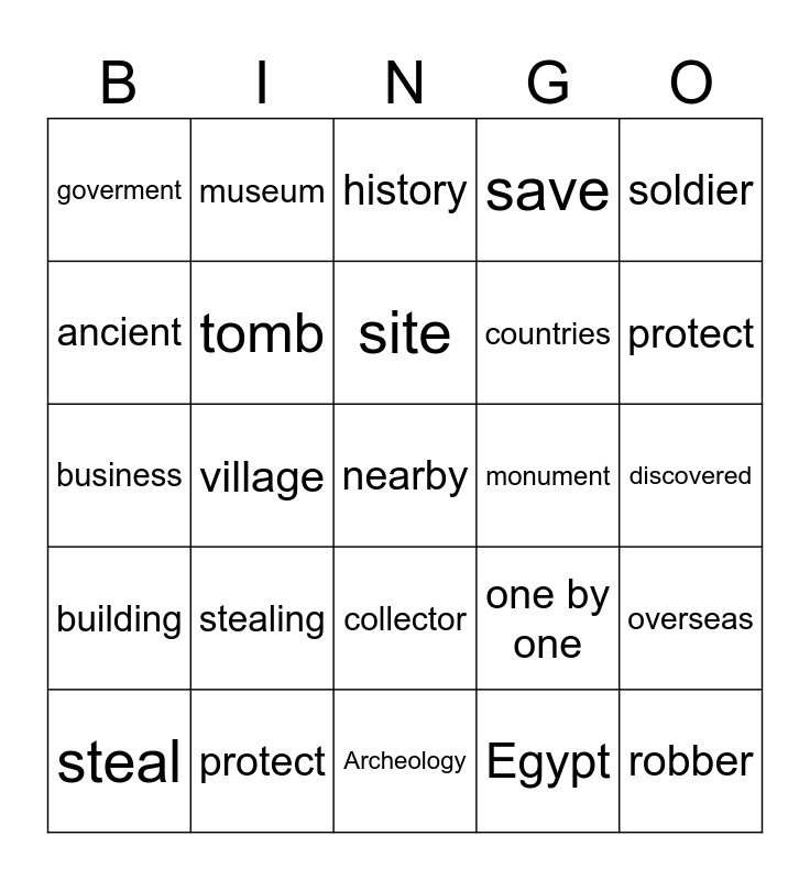 This bingo card has 25 words: stealing, Archeology, site, steal, soldier, goverment, ancient, museum, monument, collector, countries, business, one by one, overseas, tomb, robber, discovered, history, protect, village, nearby, protect, building, save and Egypt.