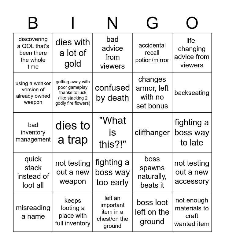 This bingo card has a free space and 24 words: not testing out a new weapon, keeps looting a place with full inventory, confused by death, misreading a name, life-changing advice from viewers, discovering a QOL that's been there the whole time, using a weaker version of already owned weapon, dies with a lot of gold, cliffhanger, fighting a boss way too early, changes armor, left with no set bonus, bad inventory management, boss spawns naturally, beats it, not testing out a new accessory, getting away with poor gameplay thanks to luck (like stacking 2 godly fire flowers), boss loot left on the ground, fighting a boss way to late, bad advice from viewers, backseating, dies to a trap, not enough materials to craft wanted item, quick stack instead of loot all, accidental recall potion/mirror and left an important item in a chest/on the ground.