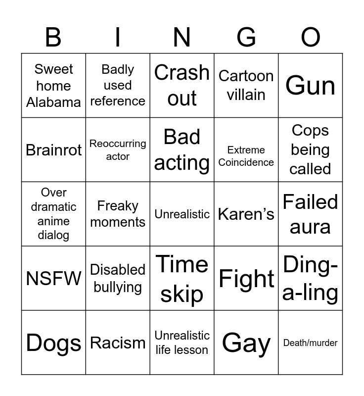 This bingo card has 25 words: NSFW, Racism, Unrealistic, Gay, Gun, Sweet home Alabama, Badly used reference, Crash out, Karen’s, Ding-a-ling, Brainrot, Reoccurring actor, Unrealistic life lesson, Fight, Cops being called, Dogs, Freaky moments, Bad acting, Extreme Coincidence, Failed aura, Over dramatic anime dialog, Disabled bullying, Time skip, Cartoon villain and Death/murder.
