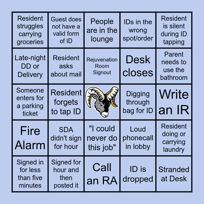 This bingo card has a free space and 46 words: Resident Forgot their ID, Stranded at Desk, Relief is late, Call an RA, SDA didn't sign for hour, "Do you need anything?", Guest does not have a valid form of ID, Hole in Parietal, Late-night DD or Delivery, Lobby Party, Resident asks about mail, IDs in the wrong spot/order, Resident doing or carrying laundry, Loud phonecall in lobby, Awkward smile, Desk Phone Rings/Use Desk Phone, Rejuvenation Room Signout, Digging through bag for ID, Scan ID while resident is on a call, Resident is silent during ID tapping, Resident forgets to tap ID, ID is dropped, Resident struggles carrying groceries, Desk closes, Guest is a minor, Parent needs to use the bathroom, Signed in for less than five minutes, "We will be quick" Is not quick, "I could never do this job", Fire Alarm, Someone asks you to sit for them, RA round, Rude residents or guests, Noon Mail, Sling notification, Signed for hour and then posted it, Write an IR, FSUPD enters building, Laundry room leaking, Noise Complaint, Forgot to get something before shift, People are in the lounge, Someone enters for a parking ticket, IDs are not handed, rather dropped/thrown, Call down the list and Restriction List addition.