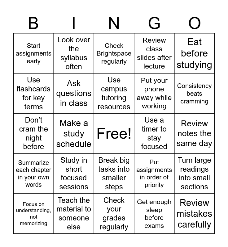 This bingo card has a free space and 24 words: Study in short focused sessions, Teach the material to someone else, Use campus tutoring resources, Focus on understanding, not memorizing, Eat before studying, Start assignments early, Use flashcards for key terms, Look over the syllabus often, Use a timer to stay focused, Break big tasks into smaller steps, Put your phone away while working, Don’t cram the night before, Put assignments in order of priority, Turn large readings into small sections, Ask questions in class, Get enough sleep before exams, Review notes the same day, Check Brightspace regularly, Consistency beats cramming, Make a study schedule, Review mistakes carefully, Summarize each chapter in your own words, Review class slides after lecture and Check your grades regularly.