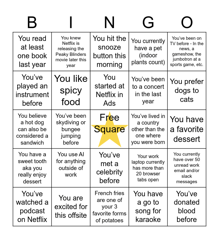 This bingo card has a free space and 35 words: You can speak 2 or more languages, You’ve completed a 5k, 10k, half marathon or full marathon before, You think pineapple does actually belong on pizza, You like spicy food, You’ve met a celebrity before, You currently have a pet (indoor plants count), You’ve played an instrument before, You’ve been at Netflix longer than 1 year, You started at Netflix in Ads, You have a Netflix Ads subscription, You believe a hot dog can also be considered a sandwich, You’ve been on TV before - In the news, a gameshow, the jumbotron at a sports game, etc., You’ve been on vacation in another country before, You’ve broken a bone before, You read at least one book last year, You’ve lived in a country other than the one where you were born, You have a go to song for karaoke, You’ve been skydiving or bungee jumping before, You have a sweet tooth aka you really enjoy dessert, You’ve donated blood before, Your work laptop currently has more than 20 browser tabs open, You’ve watched a podcast on Netflix, You currently have over 50 unread work email and/or slack messages, You are excited for this offsite, You hit the snooze button this morning, You prefer dogs to cats, You’re currently jet lagged and or sleepy, You enjoy snow activities - Skiing, snowboarding etc., You’ve been to a concert in the last year, You have a favorite dessert, You drink tea or coffee every day during the work week, French fries are one of your 3 favorite forms of potatoes, You use AI for anything outside of work, You knew Netflix is releasing the Peaky Blinders movie later this year and You’ve seen Drive to Survive on Netflix or F1 in person (F1 kicks off this weekend in Australia).