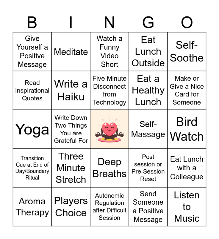 This bingo card has a free space and 27 words: Post session or Pre-Session Reset, Take a Walk Outside, Eat a Healthy Lunch, Autonomic Regulation after Difficult Session, Read Inspirational Quotes, Watch a Funny Video Short, Meditate, Transition Cue at End of Day/Boundary Ritual, Self-Massage, Eat Lunch with a Colleague, Yoga, Eat Lunch Outside, Aroma Therapy, Players Choice, Make or Give a Nice Card for Someone, Office Workout, Write a Haiku, Five Minute Disconnect from Technology, Three Minute Stretch, Give Yourself a Positive Message, Bird Watch, Send Someone a Positive Message, Write Down Two Things You are Grateful For, Listen to Music, Deep Breaths, Self-Soothe and 5-4-3-2-1 Grounding.
