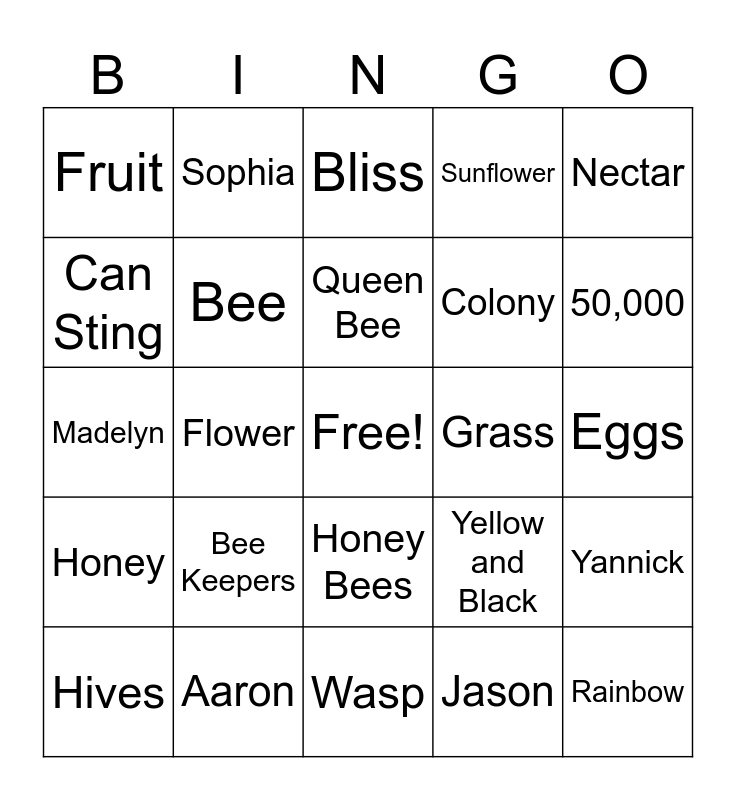 This bingo card has a free space and 39 words: Pollinators, Pollen, Bumblebee, Bee, Hives, Honey Bees, Queen Bee, Worker Bee, Nectar, Honey, Flower, Sunflower, Rainbow, Eggs, Grass, Bee Keepers, Ancient Egyptians, Fruit, Grow, Yellow and Black, Can Sting, Wasp, Colony, 50,000, Jaida, Estefany, Emily, Richie, Jethro, Sophia, Sofia, Leah, Bliss, Aaron, Jason, Dylan, Yannick, Madelyn and Ms. Calli.