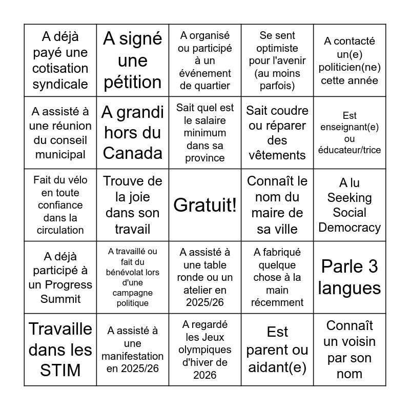 This bingo card has a free space and 24 words: A travaillé ou fait du bénévolat lors d'une campagne politique, A assisté à une manifestation en 2025/26, Sait quel est le salaire minimum dans sa province, Travaille dans les STIM, A contacté un(e) politicien(ne) cette année, A déjà payé une cotisation syndicale, A assisté à une réunion du conseil municipal, A signé une pétition, Connaît le nom du maire de sa ville, A assisté à une table ronde ou un atelier en 2025/26, Sait coudre ou réparer des vêtements, Fait du vélo en toute confiance dans la circulation, A fabriqué quelque chose à la main récemment, Parle 3 langues, A grandi hors du Canada, Est parent ou aidant(e), A lu Seeking Social Democracy, A organisé ou participé à un événement de quartier, Est enseignant(e) ou éducateur/trice, Trouve de la joie dans son travail, Connaît un voisin par son nom, A déjà participé à un Progress Summit, Se sent optimiste pour l'avenir (au moins parfois) and A regardé les Jeux olympiques d'hiver de 2026.