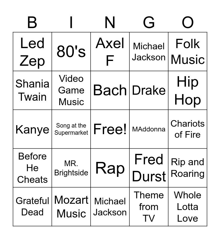 This bingo card has a free space and 24 words: MR. Brightside, Mozart Music, Bach, Grateful Dead, Folk Music, Led Zep, Shania Twain, 80's, MAddonna, Rap, Drake, Kanye, Fred Durst, Rip and Roaring, Video Game Music, Theme from TV, Chariots of Fire, Axel F, Hip Hop, Song at the Supermarket, Whole Lotta Love, Before He Cheats, Michael Jackson and Michael Jackson.