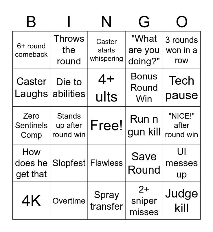 This bingo card has a free space and 29 words: 4K, Sign that cheers on player is shown, Stands up after round win, Flanker/Lurker whiffs, 6+ round comeback, Caster starts whispering, Die to abilities, Slopfest, Run n gun kill, Overtime, "NICE!" after round win, Judge kill, Spray transfer, 2+ sniper misses, Tech pause, Red Bull Clutch, Flawless, How does he get that, 3 rounds won in a row, Zero Sentinels Comp, Save Round, Eco Round Win, Bonus Round Win, Caster Laughs, "What are you doing?", Throws the round, UI messes up, 4+ ults and Body shots.