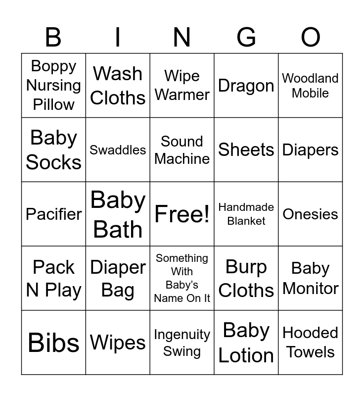 This bingo card has a free space and 27 words: Burp Cloths, Postpartum Care, Sheets, Ingenuity Swing, Baby Socks, Wipe Warmer, Wash Cloths, Pack N Play, Handmade Blanket, Baby Monitor, Pacifier, Dragon, Bibs, Wipes, Diapers, Bottles, Swaddles, Sound Machine, Diaper Bag, Boppy Nursing Pillow, Onesies, Baby Lotion, Baby Bath, Hooded Towels, Something With Baby’s Name On It, Woodland Mobile and Diaper Rash Cream.