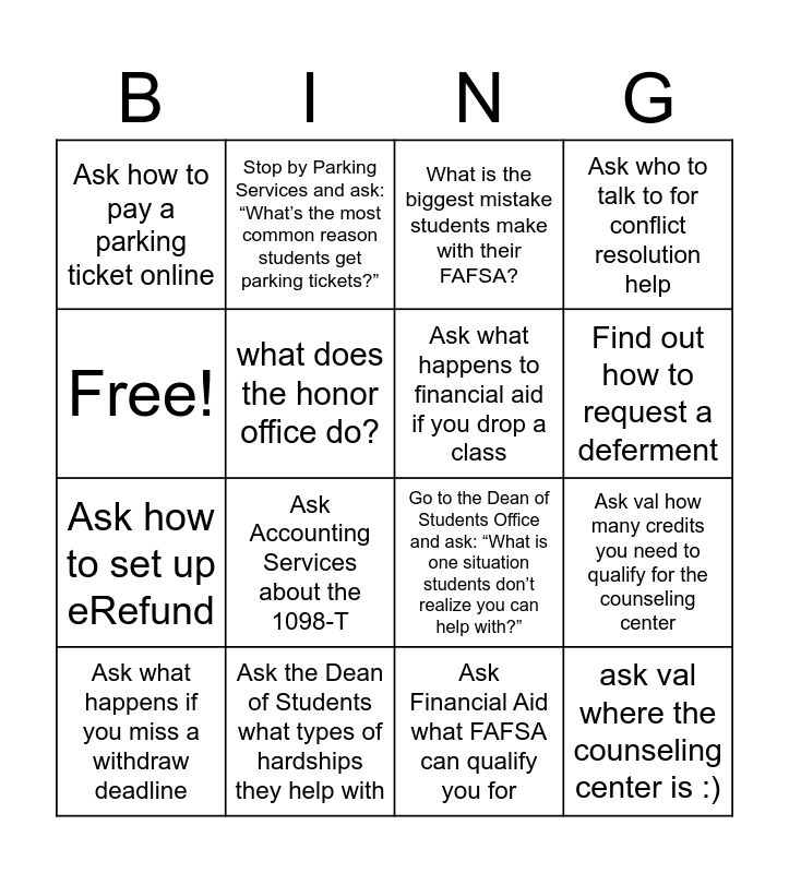 This bingo card has 16 words: Ask the Dean of Students what types of hardships they help with, Ask val how many credits you need to qualify for the counseling center, What is the biggest mistake students make with their FAFSA?, Ask how to pay a parking ticket online, Ask how to set up eRefund, Stop by Parking Services and ask: “What’s the most common reason students get parking tickets?”, Go to the Dean of Students Office and ask: “What is one situation students don’t realize you can help with?”, Ask Financial Aid what FAFSA can qualify you for, Free!, what does the honor office do?, Ask what happens if you miss a withdraw deadline, Ask who to talk to for conflict resolution help, Ask Accounting Services about the 1098-T, Find out how to request a deferment, Ask what happens to financial aid if you drop a class and ask val where the counseling center is :).