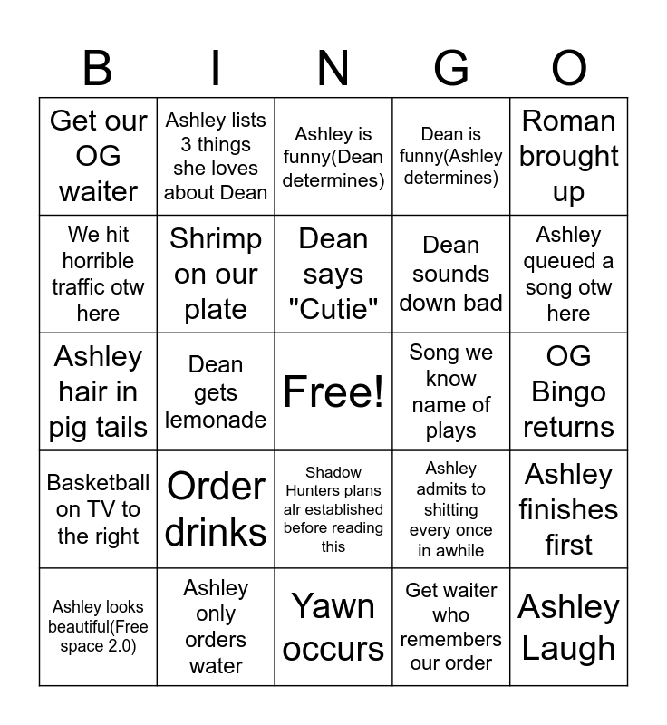 This bingo card has a free space and 29 words: Ashley looks beautiful(Free space 2.0), 8+ hushpuppies, Dean gets lemonade, Crab legs come out within 15 mins, Get our OG waiter, Ashley is funny(Dean determines), Shrimp on our plate, Order drinks, Song we know name of plays, Ashley only orders water, OG Bingo returns, Ashley Laugh, Yawn occurs, Get waiter who remembers our order, Ashley queued a song otw here, Anything but basketball on TV to the right, Shadow Hunters plans alr established before reading this, Basketball on TV to the right, Roman brought up, Ashley hair in pig tails, Ashley admits to shitting every once in awhile, Crab legs ordered, Dean sounds down bad, We hit horrible traffic otw here, Dean is funny(Ashley determines), Ashley lists 3 things she loves about Dean, Ashley finishes first, Dean says "Cutie" and Newsome reference.