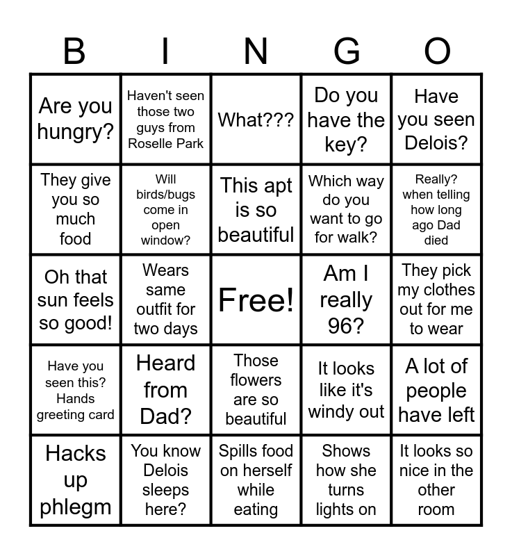 This bingo card has a free space and 24 words: Heard from Dad?, You know Delois sleeps here?, This apt is so beautiful, Hacks up phlegm, Have you seen Delois?, Are you hungry?, They give you so much food, Haven't seen those two guys from Roselle Park, Am I really 96?, Those flowers are so beautiful, Which way do you want to go for walk?, Oh that sun feels so good!, It looks like it's windy out, A lot of people have left, Will birds/bugs come in open window?, Shows how she turns lights on, They pick my clothes out for me to wear, What???, Really? when telling how long ago Dad died, Wears same outfit for two days, It looks so nice in the other room, Have you seen this? Hands greeting card, Do you have the key? and Spills food on herself while eating.