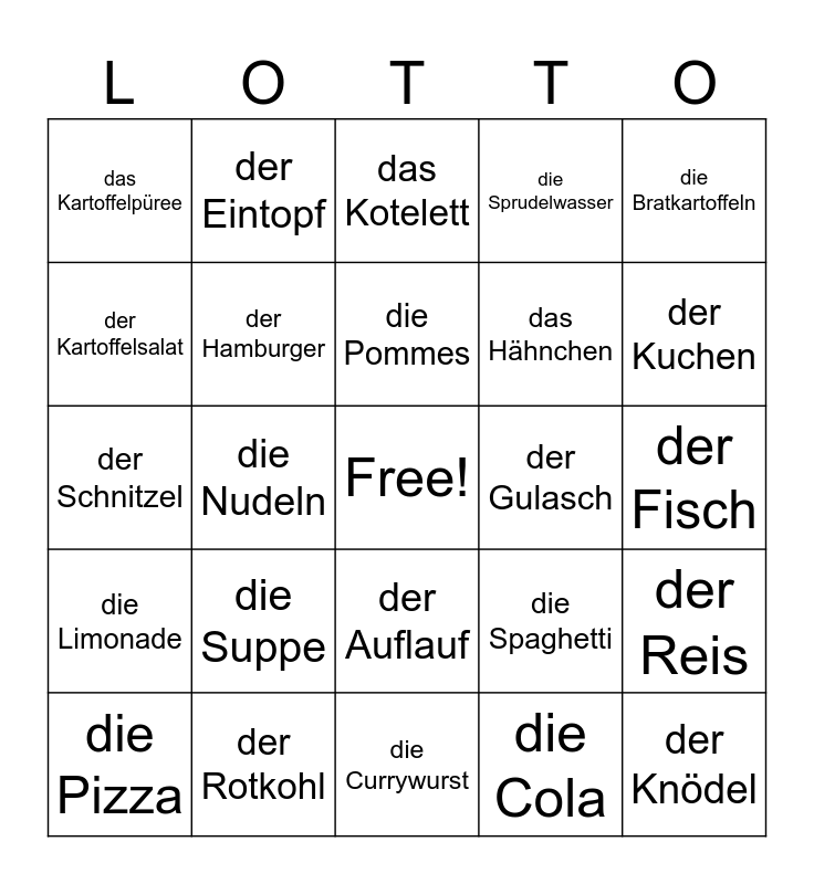 This bingo card has a free space and 25 words: die Suppe, die Currywurst, die Pommes, die Pizza, die Bratkartoffeln, das Kartoffelpüree, der Kartoffelsalat, der Eintopf, der Gulasch, der Auflauf, das Hähnchen, der Schnitzel, die Spaghetti, der Reis, der Hamburger, der Hotdog, der Fisch, das Kotelett, der Kuchen, die Nudeln, der Knödel, der Rotkohl, die Limonade, die Sprudelwasser and die Cola.