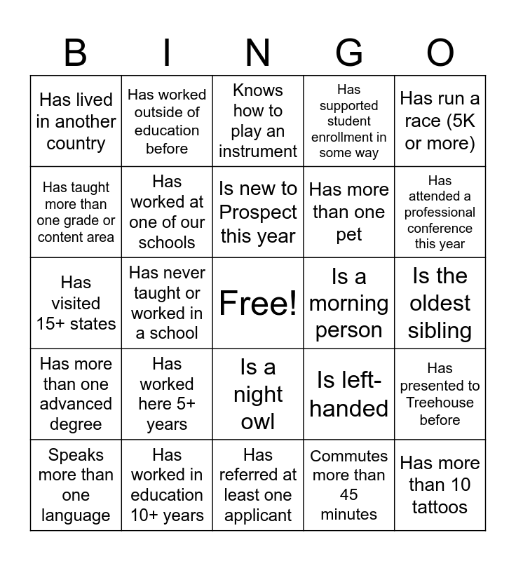 This bingo card has a free space and 24 words: Has worked here 5+ years, Has worked in education 10+ years, Is new to Prospect this year, Speaks more than one language, Has run a race (5K or more), Has lived in another country, Has taught more than one grade or content area, Has worked outside of education before, Is a morning person, Is a night owl, Has more than one pet, Has visited 15+ states, Is left-handed, Has presented to Treehouse before, Has worked at one of our schools, Commutes more than 45 minutes, Is the oldest sibling, Knows how to play an instrument, Has attended a professional conference this year, Has never taught or worked in a school, Has more than 10 tattoos, Has more than one advanced degree, Has supported student enrollment in some way and Has referred at least one applicant.