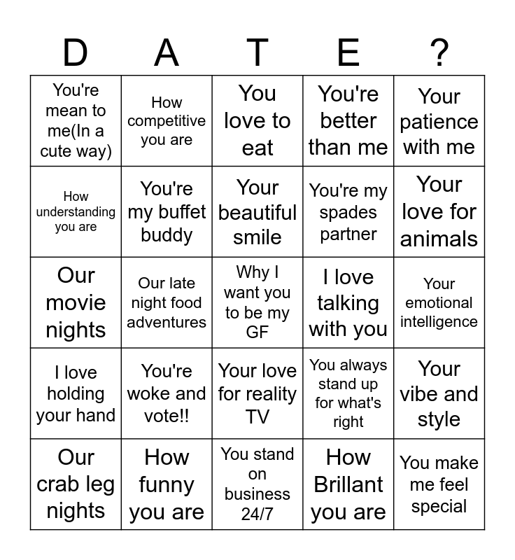 This bingo card has a free space and 24 words: You're woke and vote!!, How funny you are, Your beautiful smile, Our crab leg nights, Your patience with me, You're mean to me(In a cute way), How understanding you are, How competitive you are, I love talking with you, Your love for reality TV, You're my spades partner, Our movie nights, You always stand up for what's right, Your vibe and style, You're my buffet buddy, How Brillant you are, Your emotional intelligence, You love to eat, Your love for animals, Our late night food adventures, You make me feel special, I love holding your hand, You're better than me and You stand on business 24/7.