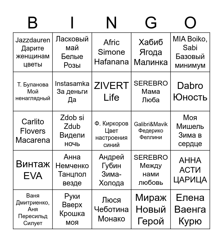 This bingo card has 45 words: Леприконсы ХАЛИ -ГАЛИ, Ф. Киркоров Цвет настроения синий, Лесоповал Я куплю тебе дом, Ваня Дмитриенко, Аня Пересильд Силует, ТАТУ НАС НЕ ДОГОНЯТ, Мираж Новый Герой, Afric Simone Hafanana, PEDRO, MIA Boiko, Sabi Базовый минимум, Руки Вверх Крошка моя, Хабиб Ягода Малинка, Galibri&Mavik Федерико Феллини, Андрей Губин Зима-Холода, Анна Немченко Танцпол везде, АИГЕЛ ПЫЯЛА, Люся Чеботина Монако, Gayazovs Brothers МАЛИНОВАЯ ЛАДА, Carlito Flovers Macarena, Kaoma Lambada, Dabro Юность, Ласковый май Белые Розы, Анна Асти По барам, Лолита На Титанике, Jazzdauren Дарите женщинам цветы, Ваня Дмитриенко Шёлк, Моя Мишель Зима в сердце, Мираж Музыка нас связала, И. Аллегрова Младший лейтенант, SEREBRO Между нами любовь, Винтаж EVA, LADY GAGA ABRACADABRA, АННА АСТИ ЦАРИЦА, Катя Лель Мой Мармеладный, М. Шуфутинский Марджанджа, Владимир Пресняков Всё нормально, Zdob si Zdub Видели ночь, Золотое кольцо Плывет веночек, Иванушки Тополиный пух, Елена Ваенга Курю, ZIVERT Life, Т. Буланова Мой ненаглядный, SEREBRO Мама Люба, 2Маши Мама я танцую, Instasamka За деньги Да and Меладзе Салют Вера.