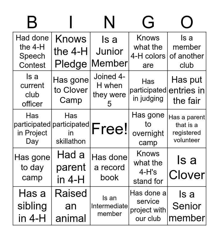 This bingo card has a free space and 24 words: Had a parent in 4-H, Raised an animal, Joined 4-H when they were 5, Has a sibling in 4-H, Is a member of another club, Had done the 4-H Speech Contest, Is a current club officer, Knows the 4-H Pledge, Has gone to overnight camp, Has done a record book, Has participated in judging, Has participated in Project Day, Knows what the 4-H's stand for, Is a Clover, Has gone to Clover Camp, Has done a service project with our club, Has a parent that is a registered volunteer, Is a Junior Member, Has put entries in the fair, Has participated in skillathon, Is a Senior member, Has gone to day camp, Knows what the 4-H colors are and Is an Intermediate member.