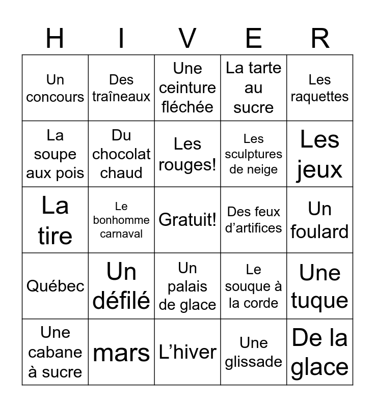 This bingo card has a free space and 29 words: Une cabane à sucre, Un château, Le bonhomme carnaval, Des chevaux, Un concours, Une ceinture fléchée, Du chocolat chaud, Un défilé, Des feux d’artifices, mars, Un foulard, De la glace, L’hiver, Une glissade, Les jeux, Des patins, Un palais de glace, Québec, Les raquettes, La tire, Le souque à la corde, Le sirop d’érable, Les sculptures de neige, La soupe aux pois, La tarte au sucre, Des traîneaux, Une tuque, Les rouges! and Les bleus!.