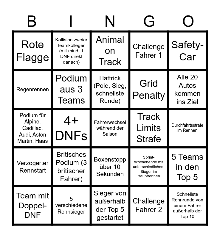 This bingo card has 25 words: Britisches Podium (3 britischer Fahrer), Sieger von außerhalb der Top 5 gestartet, Hattrick (Pole, Sieg, schnellste Runde), Team mit Doppel-DNF, Safety-Car, Rote Flagge, Regenrennen, Kollision zweier Teamkollegen (mit mind. 1 DNF direkt danach), Track Limits Strafe, Boxenstopp über 10 Sekunden, Grid Penalty, Podium für Alpine, Cadillac, Audi, Aston Martin, Haas, Sprint-Wochenende mit unterschiedlichem Sieger im Hauptrennen, 5 Teams in den Top 5, Podium aus 3 Teams, Schnellste Rennrunde von einem Fahrer außerhalb der Top 10, Durchfahrtsstrafe im Rennen, Animal on Track, Alle 20 Autos kommen ins Ziel, 4+ DNFs, Fahrerwechsel während der Saison, 5 verschiedene Rennsieger, Verzögerter Rennstart, Challenge Fahrer 1 and Challenge Fahrer 2.