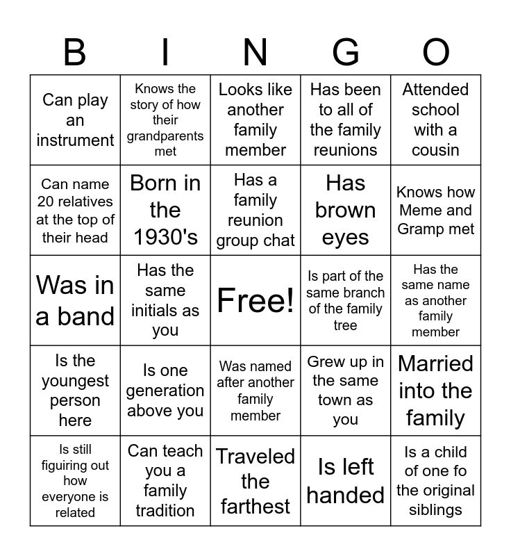 This bingo card has a free space and 24 words: Is one generation above you, Can teach you a family tradition, Has a family reunion group chat, Is still figuiring out how everyone is related, Attended school with a cousin, Can play an instrument, Can name 20 relatives at the top of their head, Knows the story of how their grandparents met, Is part of the same branch of the family tree, Was named after another family member, Has brown eyes, Was in a band, Grew up in the same town as you, Married into the family, Born in the 1930's, Is left handed, Has the same name as another family member, Looks like another family member, Knows how Meme and Gramp met, Has the same initials as you, Is a child of one fo the original siblings, Is the youngest person here, Has been to all of the family reunions and Traveled the farthest.