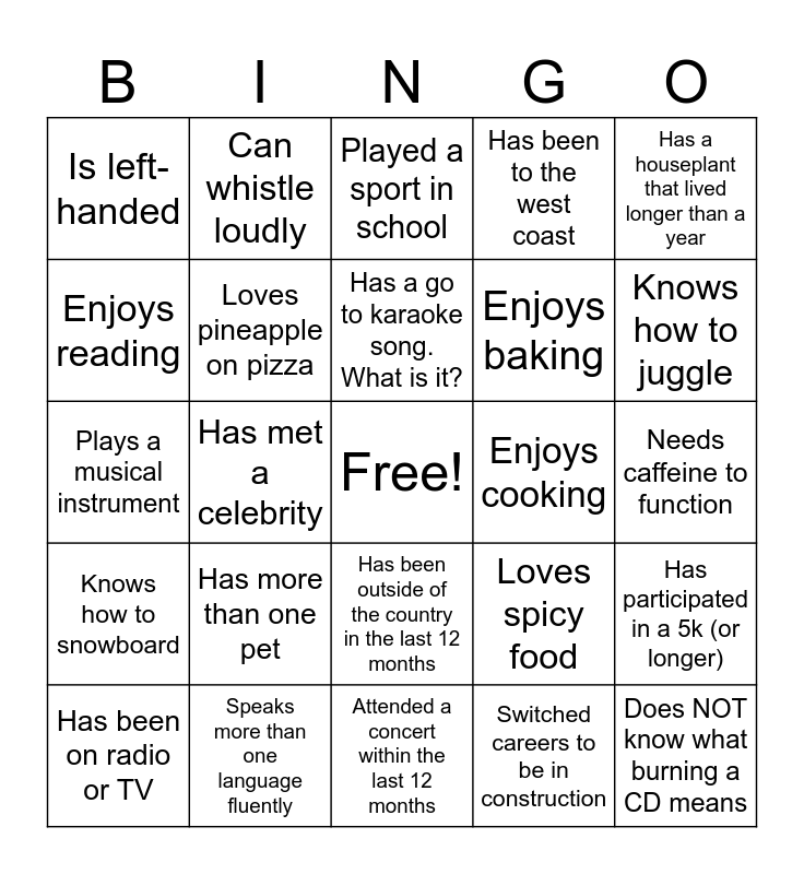 This bingo card has a free space and 24 words: Has more than one pet, Speaks more than one language fluently, Has a go to karaoke song. What is it?, Has been on radio or TV, Has a houseplant that lived longer than a year, Is left-handed, Enjoys reading, Can whistle loudly, Enjoys cooking, Has been outside of the country in the last 12 months, Enjoys baking, Plays a musical instrument, Loves spicy food, Has participated in a 5k (or longer), Loves pineapple on pizza, Switched careers to be in construction, Needs caffeine to function, Played a sport in school, Knows how to juggle, Has met a celebrity, Does NOT know what burning a CD means, Knows how to snowboard, Has been to the west coast and Attended a concert within the last 12 months.