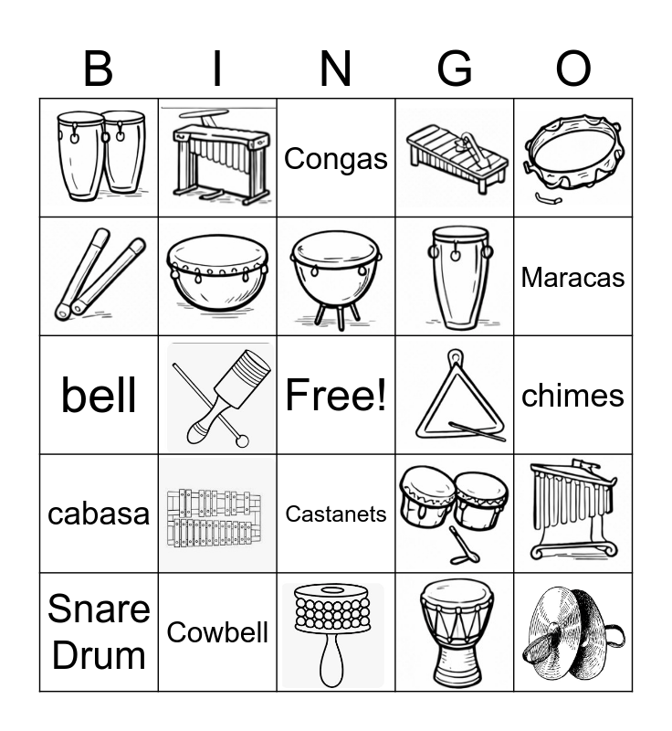 This bingo card has 24 images, a free space and 25 words: triangle, Maracas, Snare Drum, Guiro, Castanets, cabasa, bass drum, glockenspiel, djembes, tambourine, Cowbell, Wood Block, timpani, bongos, chimes, xlophone, conga, hand drum, claves, Drum kit, bell, Congas, cymbals, vibraphone and cajon.
