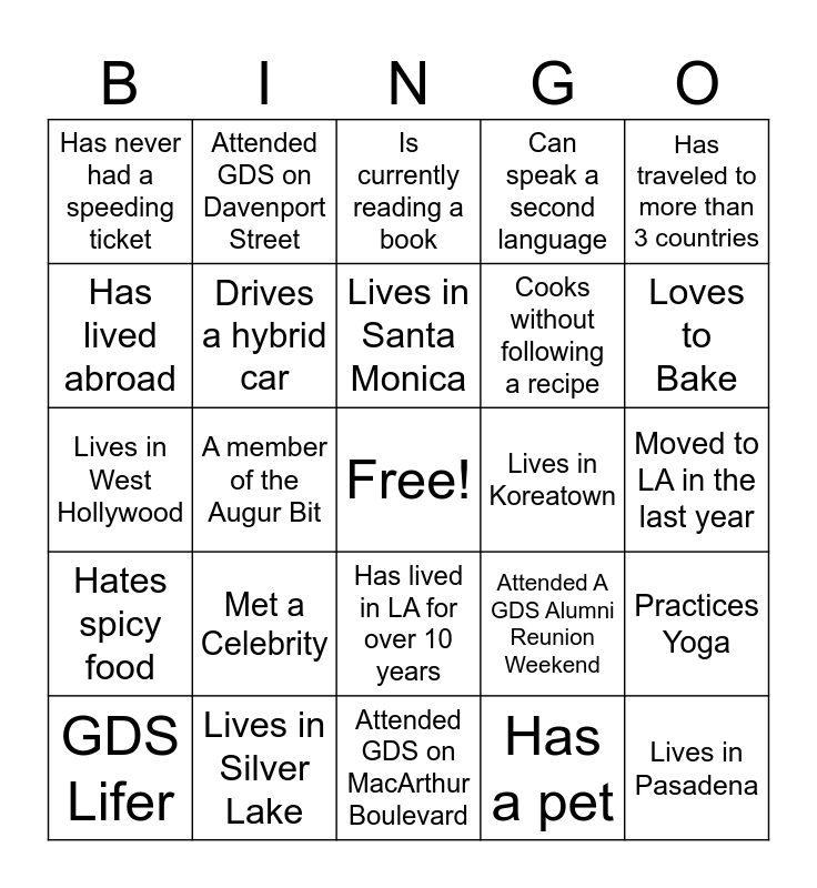 This bingo card has a free space and 24 words: GDS Lifer, Met a Celebrity, Lives in Santa Monica, Has a pet, Has traveled to more than 3 countries, Has never had a speeding ticket, Attended GDS on Davenport Street, Is currently reading a book, Lives in Koreatown, Moved to LA in the last year, Lives in West Hollywood, Drives a hybrid car, Attended A GDS Alumni Reunion Weekend, Practices Yoga, Has lived abroad, Lives in Silver Lake, Attended GDS on MacArthur Boulevard, Can speak a second language, Loves to Bake, Hates spicy food, A member of the Augur Bit, Has lived in LA for over 10 years, Cooks without following a recipe and Lives in Pasadena.