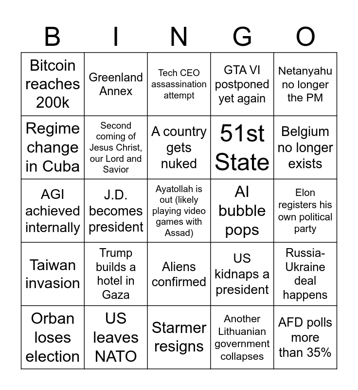 This bingo card has 25 words: Trump builds a hotel in Gaza, Starmer resigns, A country gets nuked, Orban loses election, Netanyahu no longer the PM, Bitcoin reaches 200k, Regime change in Cuba, Greenland Annex, AI bubble pops, Aliens confirmed, 51st State, AGI achieved internally, US kidnaps a president, Russia-Ukraine deal happens, Second coming of Jesus Christ, our Lord and Savior, AFD polls more than 35%, Elon registers his own political party, Tech CEO assassination attempt, Belgium no longer exists, J.D. becomes president, Ayatollah is out (likely playing video games with Assad), US leaves NATO, Taiwan invasion, GTA VI postponed yet again and Another Lithuanian government collapses.