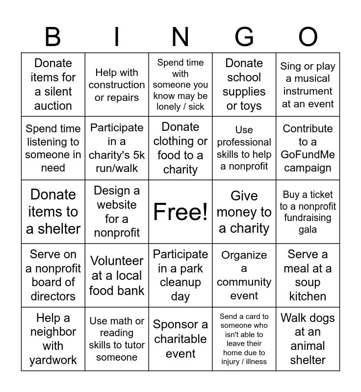 This bingo card has a free space and 24 words: Volunteer at a local food bank, Use math or reading skills to tutor someone, Donate clothing or food to a charity, Help a neighbor with yardwork, Sing or play a musical instrument at an event, Donate items for a silent auction, Spend time listening to someone in need, Help with construction or repairs, Give money to a charity, Participate in a park cleanup day, Use professional skills to help a nonprofit, Donate items to a shelter, Organize a community event, Serve a meal at a soup kitchen, Participate in a charity's 5k run/walk, Send a card to someone who isn't able to leave their home due to injury / illness, Buy a ticket to a nonprofit fundraising gala, Spend time with someone you know may be lonely / sick, Contribute to a GoFundMe campaign, Design a website for a nonprofit, Walk dogs at an animal shelter, Serve on a nonprofit board of directors, Donate school supplies or toys and Sponsor a charitable event.