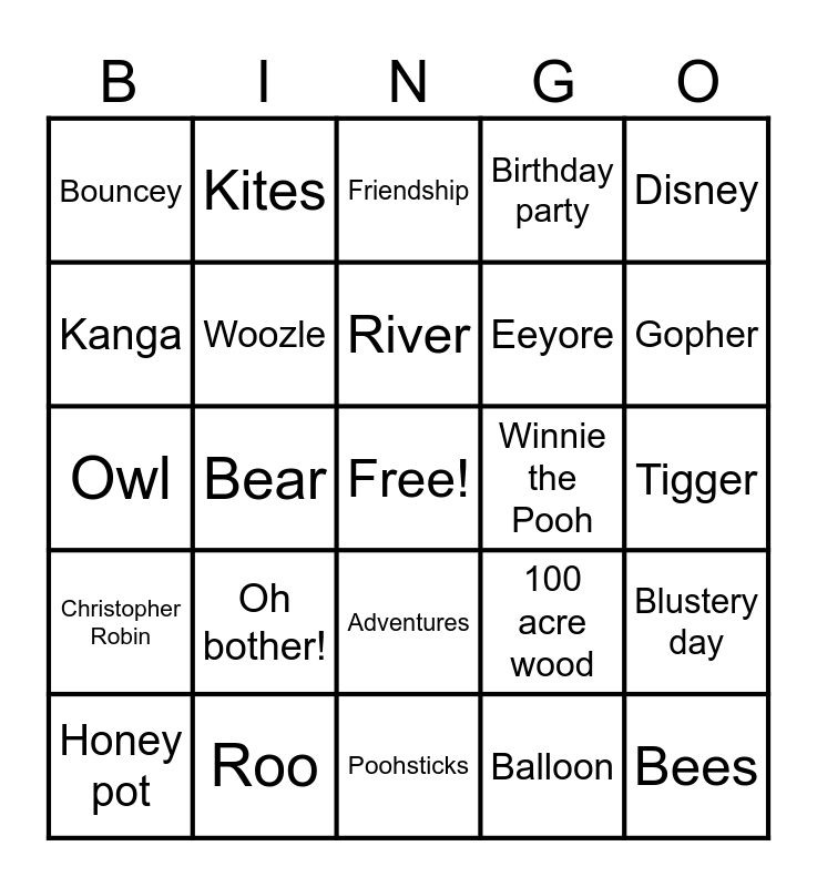 This bingo card has a free space and 29 words: Honey pot, Rabbit, Bear, Heffalump, Bouncey, Friendship, Woozle, Oh bother!, Winnie the Pooh, Roo, Tigger, Bees, Poohsticks, Balloon, Gopher, Piglet, Adventures, Christopher Robin, Disney, Owl, 100 acre wood, A. A Milne, Eeyore, Kanga, Birthday party, Kites, Blustery day, River and Bridge.