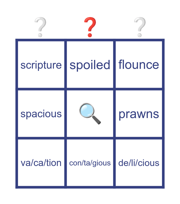 This bingo card has a free space and 8 words: prawns, flounce, spoiled, va/ca/tion, scripture, de/li/cious, spacious and con/ta/gious.