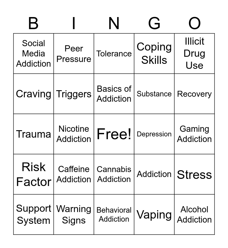 This bingo card has a free space and 27 words: Addiction, Habit, Substance, Behavioral Addiction, Craving, Tolerance, Peer Pressure, Risk Factor, Depression, Stress, Trauma, Coping Skills, Support System, Warning Signs, Recovery, Treatment, Triggers, Basics of Addiction, Caffeine Addiction, Social Media Addiction, Gaming Addiction, Vaping, Nicotine Addiction, Alcohol Addiction, Cannabis Addiction, Illicit Drug Use and Resisting Peer Pressure.
