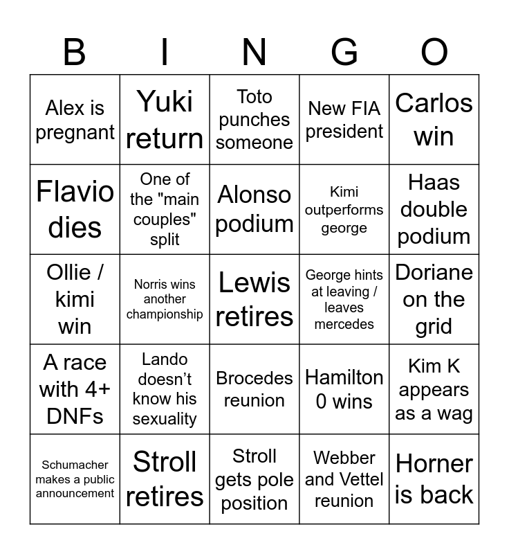 This bingo card has 25 words: Lando doesn’t know his sexuality, Stroll gets pole position, Alonso podium, Schumacher makes a public announcement, Carlos win, Alex is pregnant, Flavio dies, Yuki return, George hints at leaving / leaves mercedes, Brocedes reunion, Kimi outperforms george, Ollie / kimi win, Hamilton 0 wins, Kim K appears as a wag, One of the "main couples" split, Horner is back, Doriane on the grid, Toto punches someone, Haas double podium, Norris wins another championship, Lewis retires, Stroll retires, A race with 4+ DNFs, New FIA president and Webber and Vettel reunion.