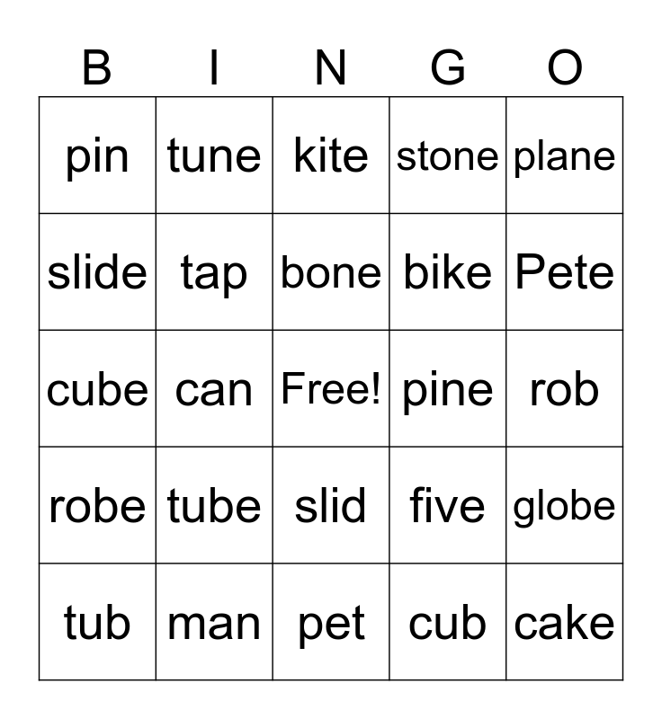 This bingo card has a free space and 29 words: tub, mane, can, tape, pin, kite, tap, tube, pine, man, rob, cake, pet, cub, Pete, cone, slid, robe, plane, cube, five, plan, bike, slide, stone, tune, globe, bone and cane.
