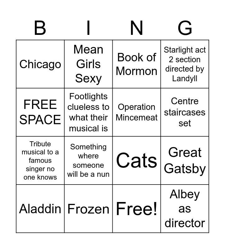 This bingo card has 17 words: Free!, Aladdin, Book of Mormon, Chicago, Something where someone will be a nun, Starlight act 2 section directed by Landyll, Great Gatsby, Operation Mincemeat, Centre staircases set, Footlights clueless to what their musical is, Frozen, Cats, FREE SPACE, Mean Girls Sexy, Tribute musical to a famous singer no one knows, Sondheim musical and Albey as director.