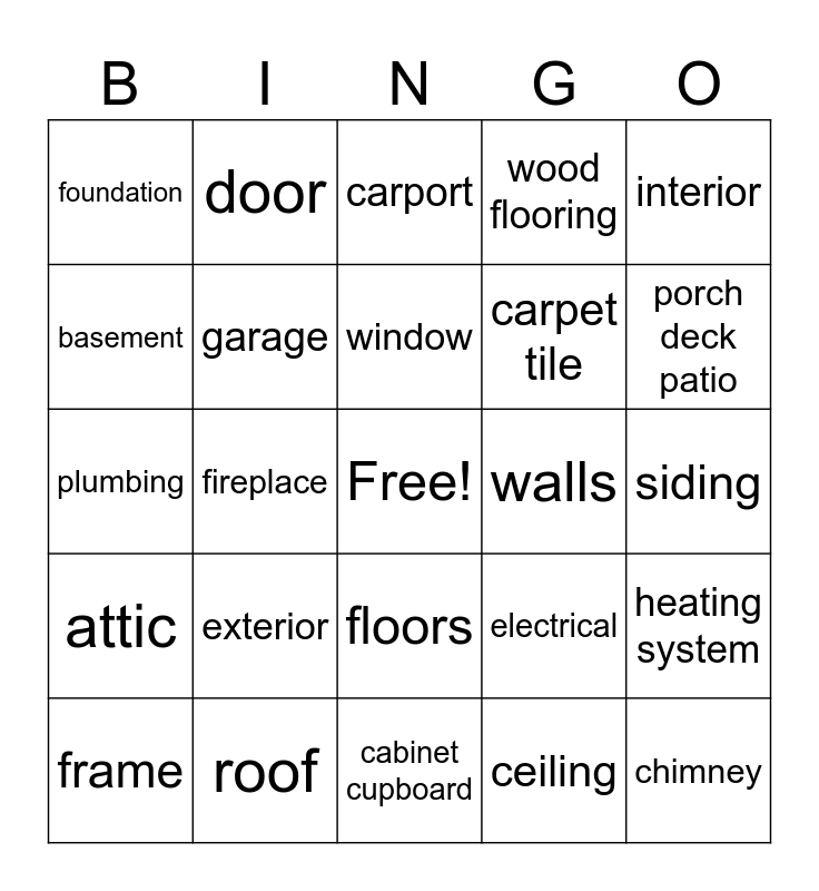 This bingo card has a free space and 24 words: exterior, roof, window, frame, interior, foundation, basement, door, walls, floors, carpet tile, plumbing, electrical, heating system, garage, ceiling, siding, carport, porch deck patio, fireplace, chimney, attic, wood flooring and cabinet cupboard.
