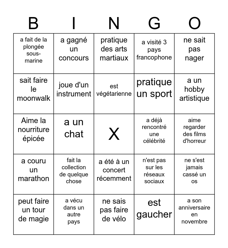 This bingo card has a free space and 32 words: sait surfer, a vécu dans un autre pays, ne sais pas faire de vélo, a un chien, a un hobby artistique, a fait de la plongée sous-marine, a un chat, a été à un concert récemment, a visité 3 pays francophone, a son anniversaire en novembre, sait faire le moonwalk, a gagné un concours, est gaucher, est végétarien(ne), a couru un marathon, a écrit un roman ou veut écrire un roman à l'avenir, n'aime pas les sucreries, a déjà rencontré une célébrité, aime regarder des films d'horreur, peut faire un tour de magie, fait la collection de quelque chose, connaît la langue des signes, n'est pas sur les réseaux sociaux, ne s'est jamais cassé un os, Aime la nourriture épicée, joue d'un instrument, pratique des arts martiaux, pratique un sport, ne sait pas nager, peut faire l'équilibre sur les mains, ne consomme pas de caféine and est végétarienne.