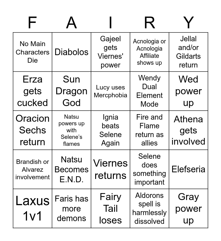 This bingo card has 25 words: Natsu Becomes E.N.D., Fairy Tail loses, Lucy uses Mercphobia, Laxus 1v1, Jellal and/or Gildarts return, No Main Characters Die, Erza gets cucked, Diabolos, Fire and Flame return as allies, Viernes returns, Wendy Dual Element Mode, Oracion Sechs return, Selene does something important, Elefseria, Sun Dragon God, Gray power up, Athena gets involved, Gajeel gets Viernes' power, Wed power up, Natsu powers up with Selene’s flames, Ignia beats Selene Again, Faris has more demons, Brandish or Alvarez involvement, Acnologia or Acnologia Affiliate shows up and Aldorons spell is harmlessly dissolved.