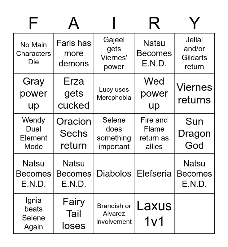 This bingo card has a free space and 27 words: Natsu Becomes E.N.D., Fairy Tail loses, Lucy uses Mercphobia, Laxus 1v1, Jellal and/or Gildarts return, No Main Characters Die, Erza gets cucked, Diabolos, Fire and Flame return as allies, Viernes returns, Wendy Dual Element Mode, Oracion Sechs return, Elefseria, Sun Dragon God, Gray power up, Athena gets involved, Gajeel gets Viernes' power, Wed power up, Ignia beats Selene Again, Faris has more demons, Brandish or Alvarez involvement, Acnologia or Acnologia Affiliate shows up, Natsu Becomes E.N.D., Natsu Becomes E.N.D., Natsu Becomes E.N.D., Natsu Becomes E.N.D. and Natsu Becomes E.N.D..