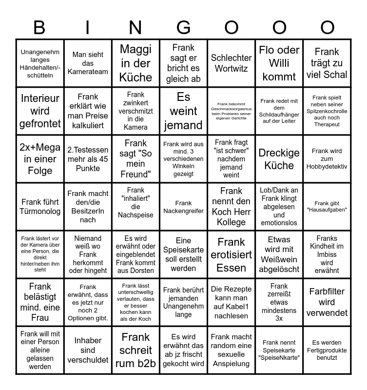 This bingo card has a free space and 55 words: Frank macht random eine sexuelle Anspielung, Frank wird zum Hobbydetektiv, "Radikaler Neuanfang bzw radikale Veränderung", Unangenehm langes Händehalten/-schütteln, Frank macht den/die BesitzerIn nach, Frank erwähnt, dass es jetzt nur noch 2 Optionen gibt., Frank trägt zu viel Schal, Frank erwähnt sein eigenes Restaurant, Frank erklärt wie man Preise kalkuliert, Frank lässt unterschwellig verlauten, dass er besser kochen kann als der Koch, Frank sagt er bricht es gleich ab, Franks Kindheit im Imbiss wird erwähnt, Frank gibt "Hausaufgaben", Lob/Dank an Frank klingt abgelesen und emotionslos, Frank will mit einer Person alleine gelassen werden, Frank lästert vor der Kamera über eine Person, die direkt hinter/neben ihm steht, Schlechter Wortwitz, Frank bekommt Geschmacksorgasmus beim Probieren seiner eigenen Gerichte, Frank nennt Speisekarte "SpeiseNkarte", Frank redet mit dem Schildaufhänger auf der Leiter, Frank spielt neben seiner Spitzenkochrolle auch noch Therapeut, Niemand weiß wo Frank herkommt oder hingeht, Frank fragt "ist schwer" nachdem jemand weint, Maggi in der Küche, "Service rettet, mit min. 2 Punkte mehr", Interieur wird gefrontet, Frank "inhaliert" die Nachspeise, Frank bekommt ein Abschiedsgeschenk, 2x+Mega in einer Folge, Dreckige Küche, Frank Gestikuliert wild herum, Etwas wird mit Weißwein abgelöscht, Farbfilter wird verwendet, Inhaber sind verschuldet, Flo oder Willi kommt, Es weint jemand, Frank belästigt mind. eine Frau, 2.Testessen mehr als 45 Punkte, Es werden Fertigprodukte benutzt, Es wird erwähnt oder eingeblendet Frank kommt aus Dorsten, Man sieht das Kamerateam, Frank berührt jemanden Unangenehm lange, Die Rezepte kann man auf Kabel1 nachlesen, Wände werden Grau oder Mintgrün gestrichen, Frank sagt "So mein Freund", Frank führt Türmonolog, Frank schreit rum b2b, Frank erotisiert Essen, Frank nennt den Koch Herr Kollege, Frank zwinkert verschmitzt in die Kamera, Eine Speisekarte soll erstellt werden, Frank zerreißt etwas mindestens 3x, Es wird erwähnt das ab jz frischt gekocht wird, Frank wird aus mind. 3 verschiedenen Winkeln gezeigt and Frank braucht eine Pause.