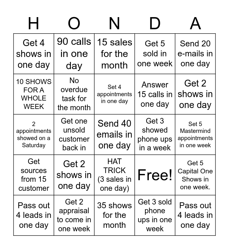 This bingo card has 25 words: Get 2 shows in one day, 35 shows for the month, Set 4 appointments in one day, Pass out 4 leads in one day, Send 20 e-mails in one day, Get 4 shows in one day, 10 SHOWS FOR A WHOLE WEEK, 90 calls in one day, Get 3 showed phone ups in a week, HAT TRICK (3 sales in one day), Answer 15 calls in one day, 2 appointments showed on a Saturday, Free!, Get 5 Capital One Shows in one week., No overdue task for the month, Pass out 4 leads in one day, Set 5 Mastermind appointments in one week, 15 sales for the month, Get 2 shows in one day, Get one unsold customer back in, Send 40 emails in one day, Get 2 appraisal to come in one week, Get sources from 15 customer, Get 5 sold in one week and Get 3 sold phone ups in one week.