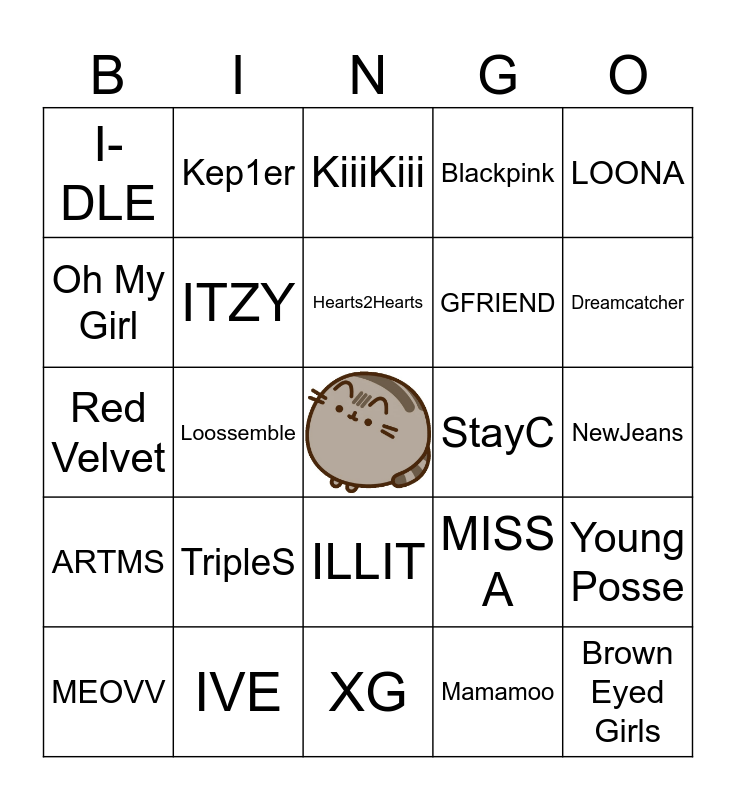 This bingo card has a free space and 40 words: TWICE, Red Velvet, NMIXX, ITZY, IVE, ILLIT, Hearts2Hearts, BABYMONSTER, LOONA, ARTMS, Loossemble, Blackpink, Brown Eyed Girls, NewJeans, StayC, TripleS, Girls' Generation, I-DLE, Purple Kiss, KiiiKiii, Young Posse, Mamamoo, GFRIEND, Oh My Girl, WJSN, I.O.I, Everglow, Fromis_9, LE SSERAFIM, Fifty Fifty, IZ*ONE, MEOVV, Wonder Girls, MISS A, Dreamcatcher, XG, Unis, aespa, Kep1er and f(x).