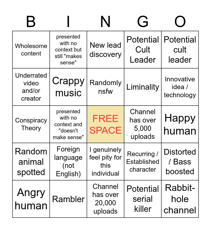 This bingo card has a free space and 24 words: Foreign language (not English), Rambler, Randomly nsfw, Angry human, Potential cult leader, Wholesome content, Underrated video and/or creator, presented with no context but still "makes sense", Channel has over 5,000 uploads, I genuinely feel pity for this individual, Liminality, Conspiracy Theory, Recurring / Established character, Distorted / Bass boosted, Crappy music, Potential serial killer, Happy human, New lead discovery, Innovative idea / technology, presented with no context and "doesn't make sense", Rabbit-hole channel, Random animal spotted, Potential Cult Leader and Channel has over 20,000 uploads.